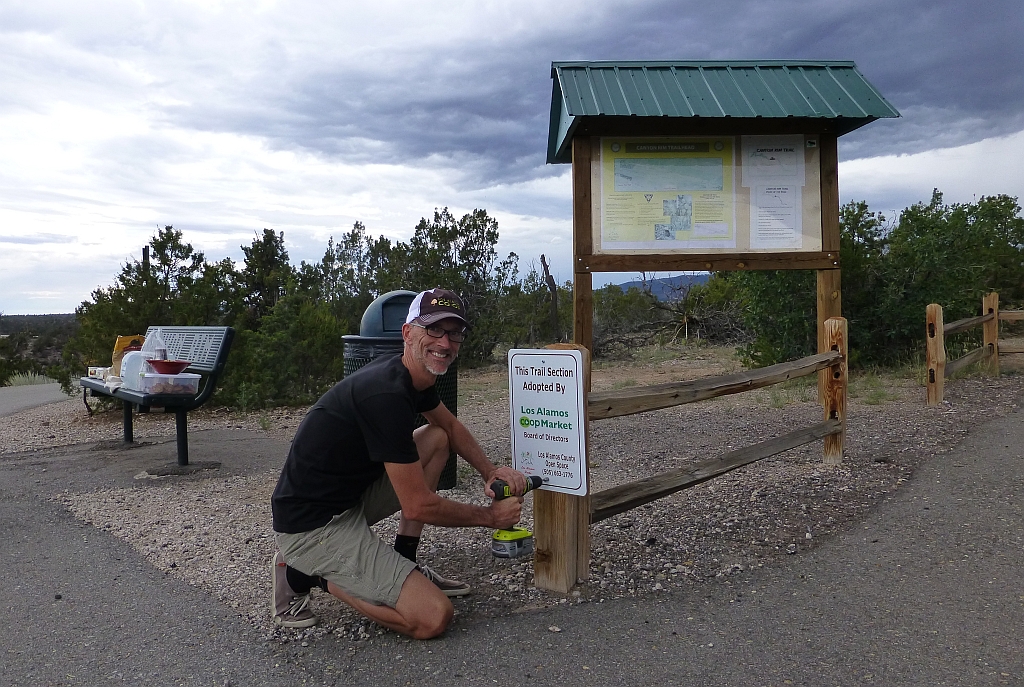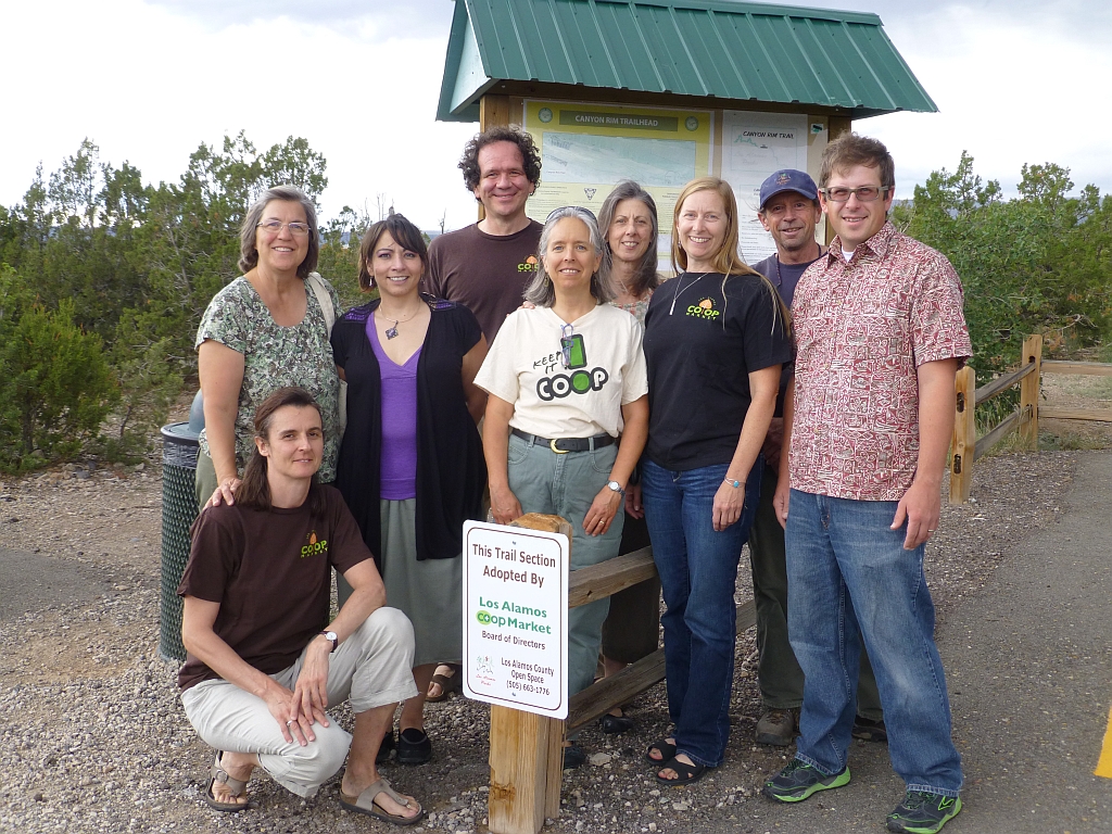 The Los Alamos Co+op Market Board of Directors and Los Alamos County Open Space Specialist Craig Martin recently dedicating the new trail sign celebrating the Board’s adoption of the Canyon Rim Trail directly across from the Co+op Market. From left, Cecile Hemez, Karen Kendall, Melinda Fuller, Ed Santiago, Gale Zander-Barlow, Nancy Savoia, Tracy McFarland, Craig Martin and newly appointed Co+op Board Member David Fellenz. Courtesy photo