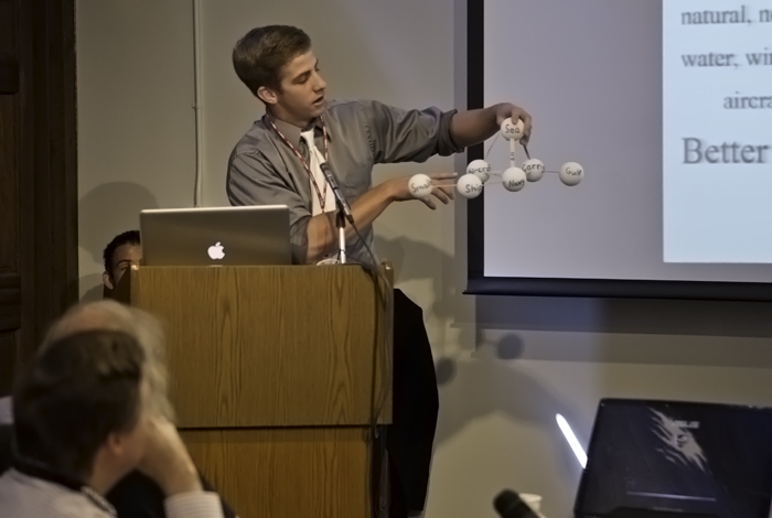 Justin Sanchez of Albuquerque’s La Cueva High School during the finalist team judging at the New Mexico Supercomputing Challenge expo and awards ceremony at Los Alamos National Laboratory. The styrofoam balls represent a word while the sticks that connect them represent a correlation between the words. Courtesy photo