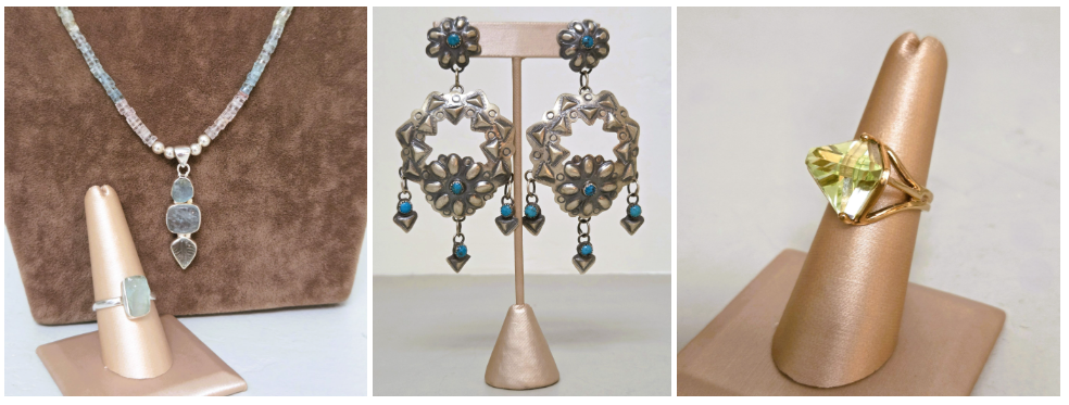 From left to right: Aquamarine necklace and ring, sterling silver earrings, fantasy-cut green Topaz ring in 14k gold. Courtesy photo