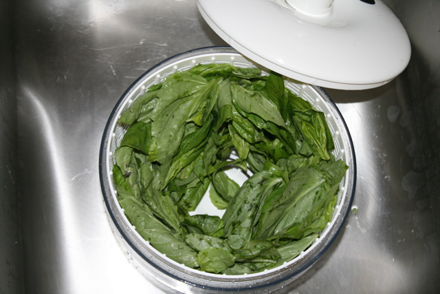 Clean basil leaves in a salad spinner, if you have one. If you don’t, you can clean them under running water before you take them off the stems. Dry them well.