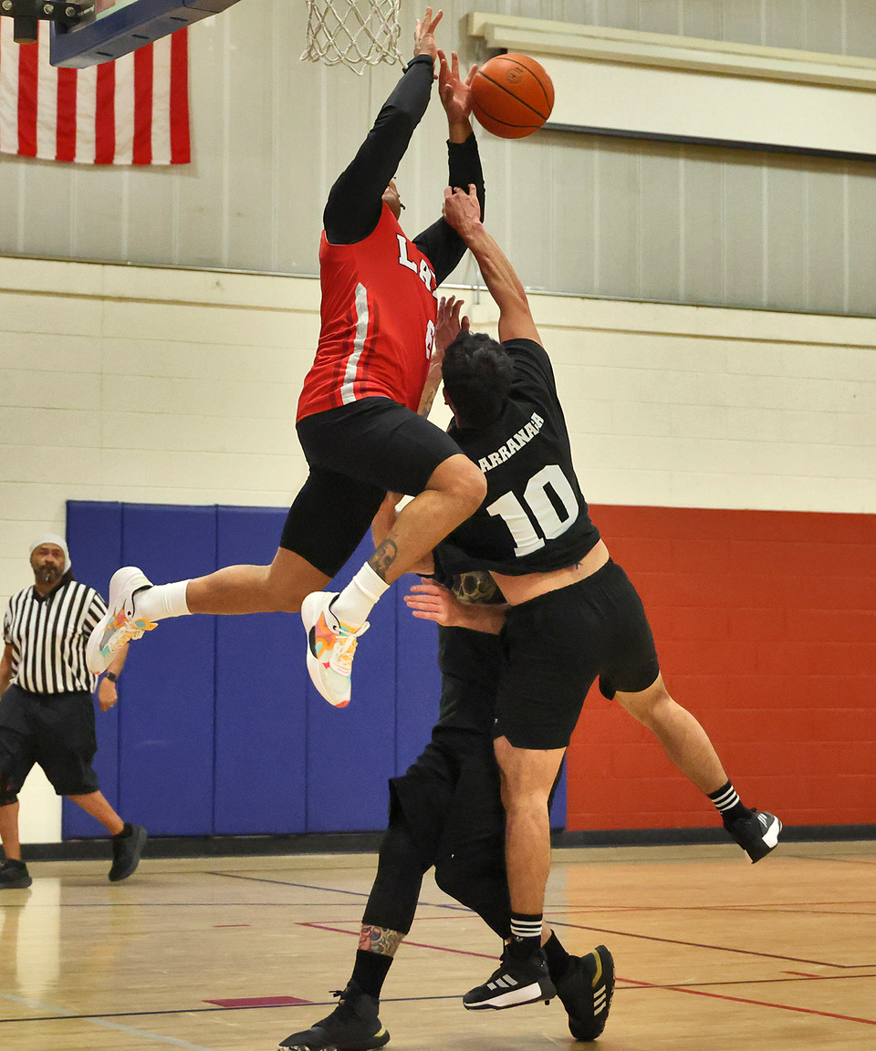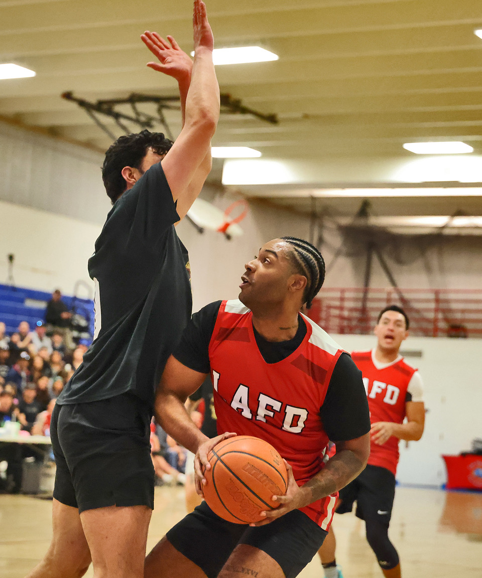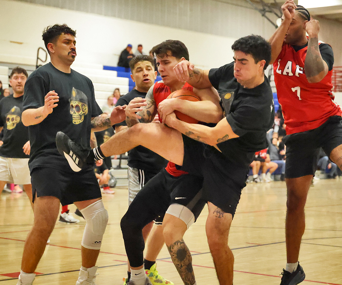 Los Alamos Firefighter Lucas Conway struggles to maintain control of the ball as Santa Fe Firefighters try to rip it from his grip. Conway scored 15 points in the game. Photo by John McHale/ladailyposttest.ortizaudio.net