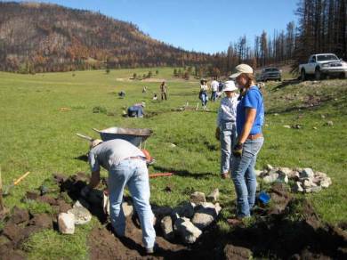 Volunteers create a ‘Zuni’ rock bowl. Bill Zeedyk of Zeedyk Ecological Consulting has co-designed an innovative water retention structure called a ‘Zuni’ rock bowl which creates small meandering pools along a creek path. Zeedyk advises Los Amigos on riparian restoration at the Valles Caldera National Preserve. Courtesy/Los Amigos de Valles Caldera