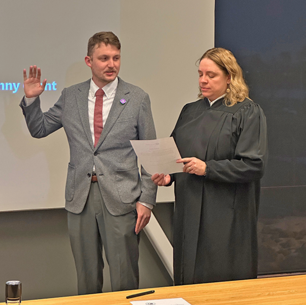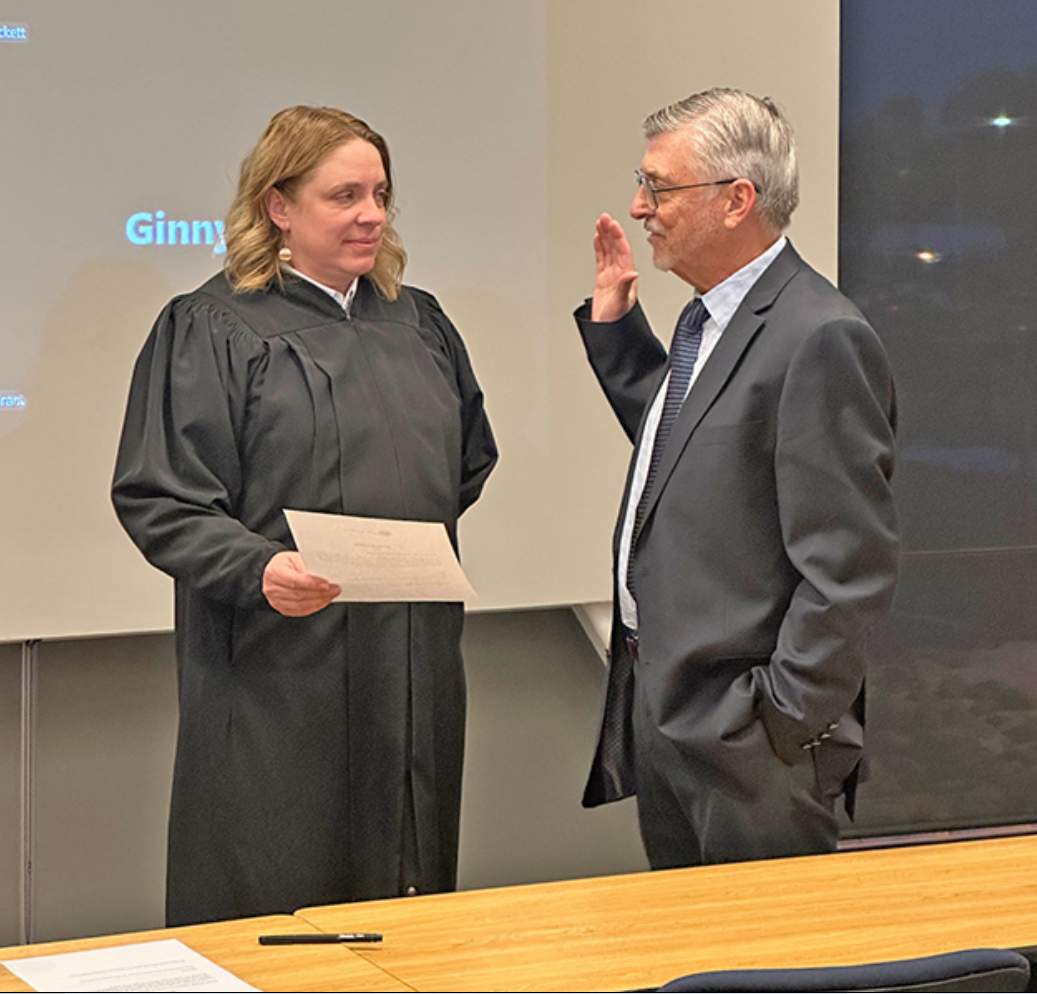 Municipal Judge Elizabeth Allen swears in newly elected UNM-LA Advisory Board member Andrew Wright Monday evening