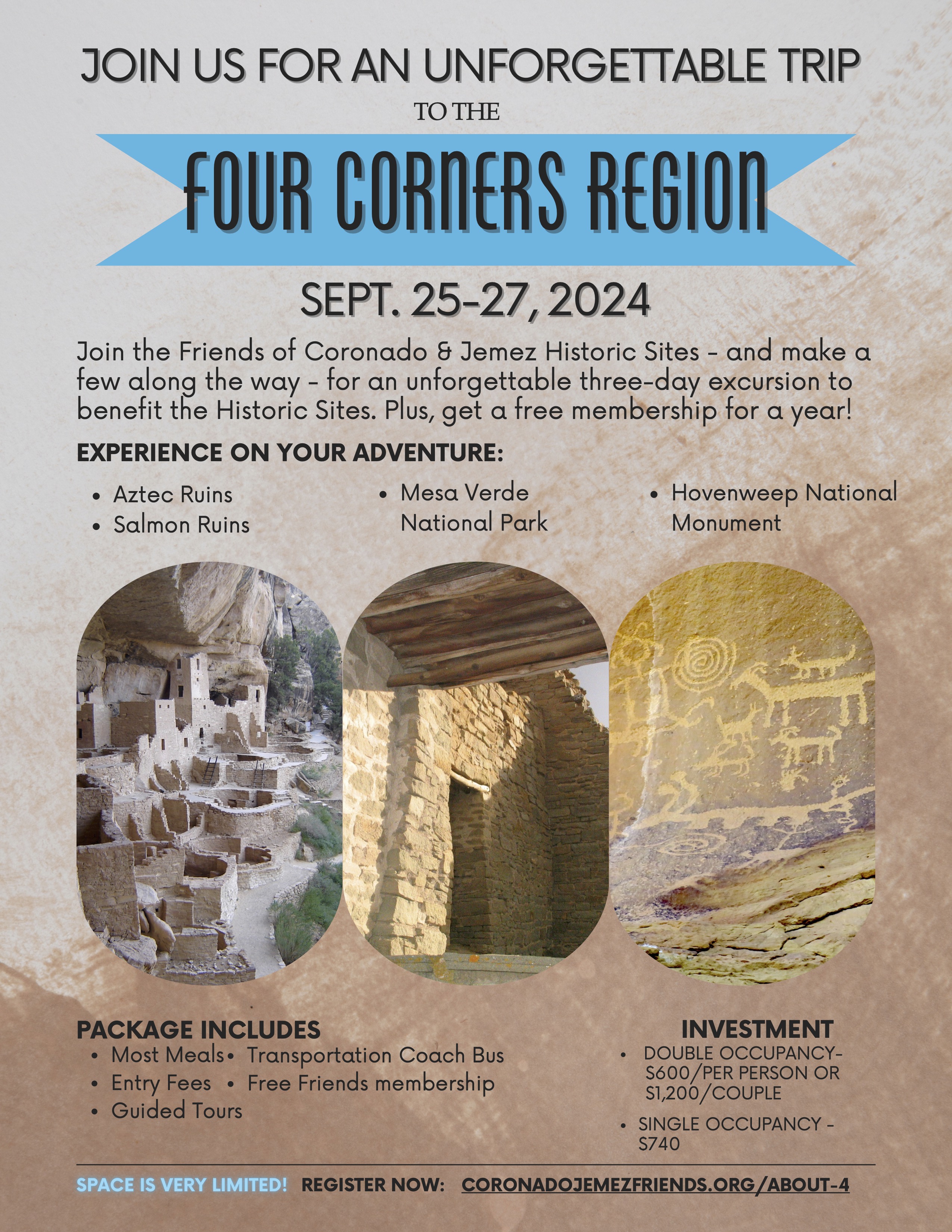BERNALILLO — The Friends of Coronado and Jemez Historic Site (“Friends”) is hosting a fundraising tour of the Four Corners region from Sept. 25-27, 2024 to benefit the Coronado and Jemez Historic Sites. The tour includes stops at several historic parks and archaeological ruins around the Four Corners region.