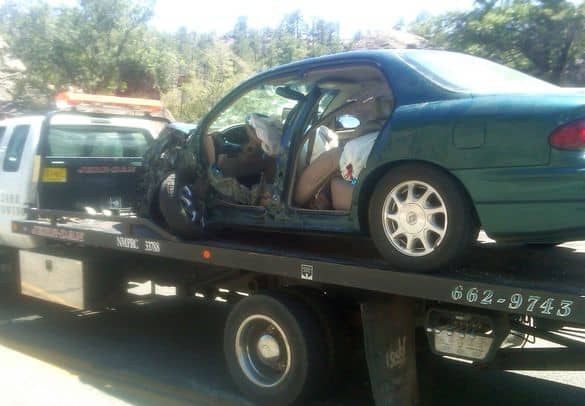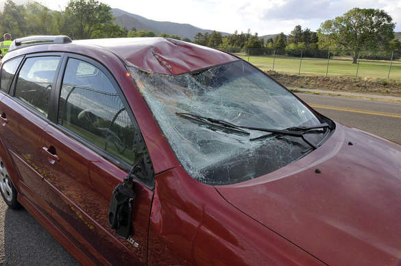 A deer jumped out in front of this hatchback sedan this evening on Diamond Drive causing extensive damage. The deer lost his life in the collision. Photo by Greg Kendall/ladailyposttest.ortizaudio.net