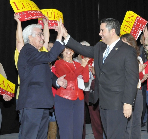 Former New Mexico House Speaker Ben Lujan high fives son Rep. Ben Ray Lujan who won the Democratic Party Pre-Primary Convention garnering 91.91 percent of the delegate’s vote to Harry B. Montoya’s 8.09 percent at the Albuquerque Convention Center Saturday. Photo by Greg Kendall/ladailyposttest.ortizaudio.net